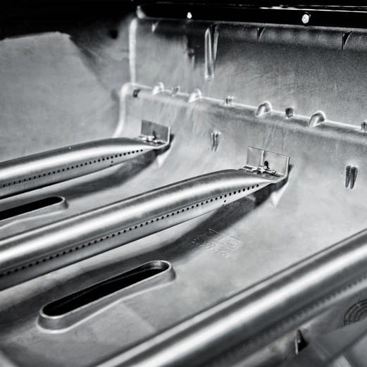 Die leistungsstarken Dual Tube Edelstahlbrenner mit jeweils 3,1 kW sind in einer hochwertigen Therma Cast Aluminiumguss Brennerwanne verbaut. Das Zusammenspiel der Dual Tube Brenner in Verbindung mit der geschlossenen Alugusswanne bietet besonders hohe Temperaturen und eine ideale Hitzeverteilung.