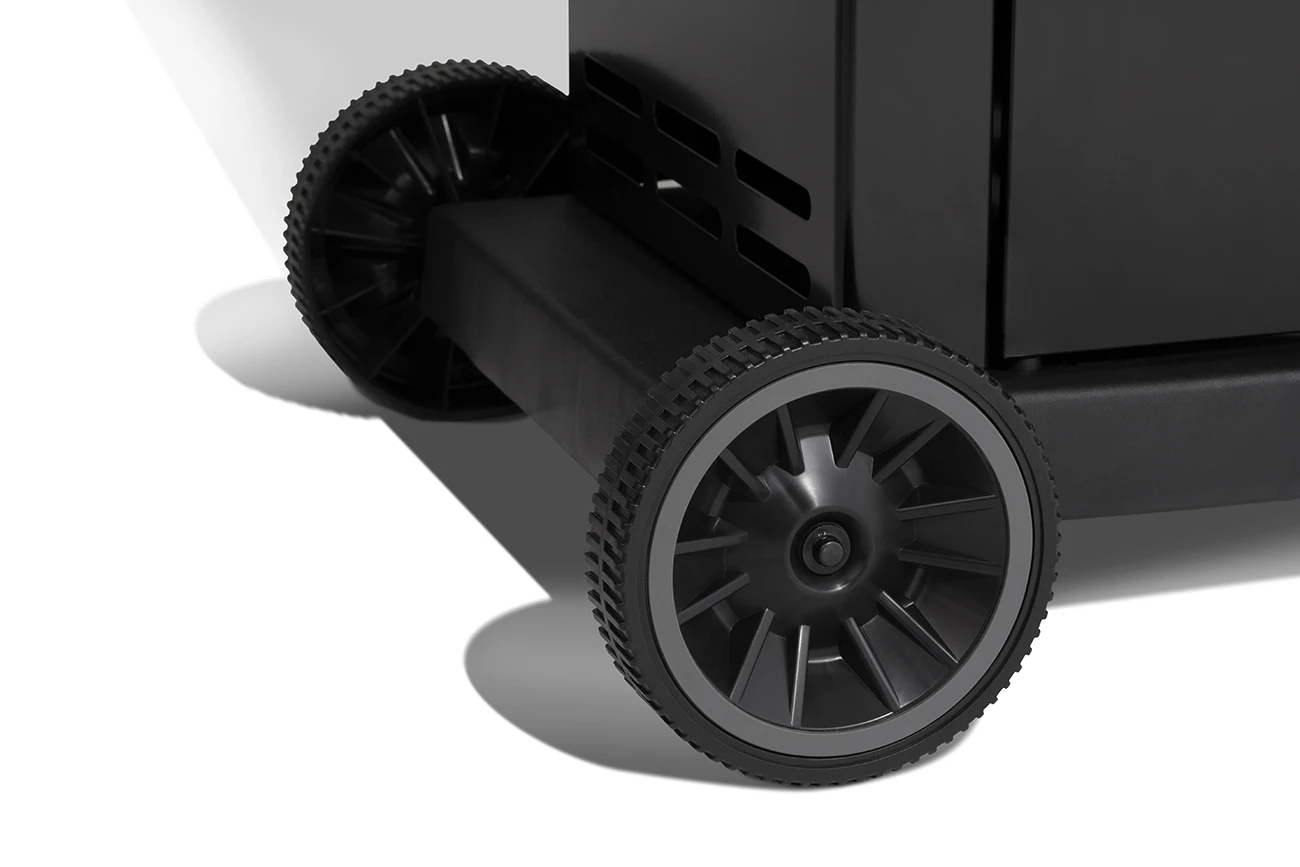 Robust und stabil überzeugt der schwarz lackierte Unterwagen mit zwei großen Rädern und zwei feststellbaren Lenkrollen. So kann der Gasgrill jederzeit bequem gerollt werden und bleibt mobil. Die Gasflasche verstauen sie praktischerweise direkt im Unterschrank.