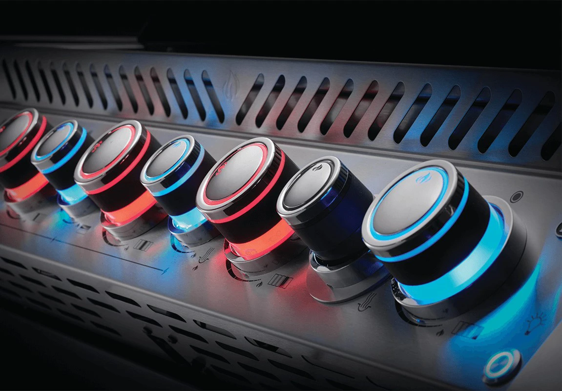 Auch die Drehregler sind mit einer genialen mehrfarbigen Beleuchtung mit Safety Glow versehen. In Nullstellung leuchten die Drehregler in blauer Farbe. Sobald ein Drehregler jedoch aufgedreht wird, wechselt die Farbe von Blau zu Rot. So können Sie auf den ersten Blick sehen, welche Brenner gerade mit Gas versorgt werden und welche ausgeschaltet sind. Dies sorgt nicht nur für neugierige Blicke am Grill. Es ist auch ein deutliches Plus an Sicherheit, denn eingeschaltete Brenner, die evtl. nicht brennen, lassen sich einwandfrei identifizieren.