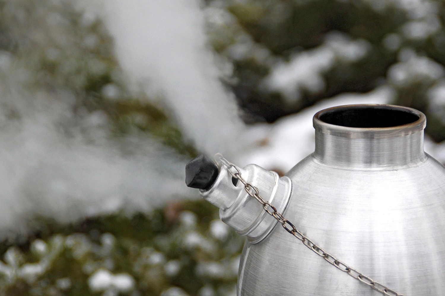 Entzünden Sie in der Feuerschale der Kanne ein Feuer. Dank des Kamineffektes im inneren der Kanne entsteht schon nach kurzer Zeit eine große Hitze, mit der das Wasser in der Kammer rund um den Kamin erhitzt wird. Sobald das Wasser den Siedepunkt erreicht hat, gibt die Dampf-Pfeife ein Signal.